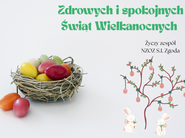 Szanowni Pacjenci, z okazji nadchodzących Świąt Wielkanocnych życzymy Państwu przede wszystkim zdrowia, spokoju oraz chwili wytchnienia od codziennych obowiązków. Niech ten wiosenny czas przyniesie więcej energii, optymizmu i dobrego samopoczucia. Życzymy wielu powodów do uśmiechu, serdecznych spotkań z bliskimi oraz pomyślności na każdy dzień. Z wyrazami szacunku, Zespół Przychodni