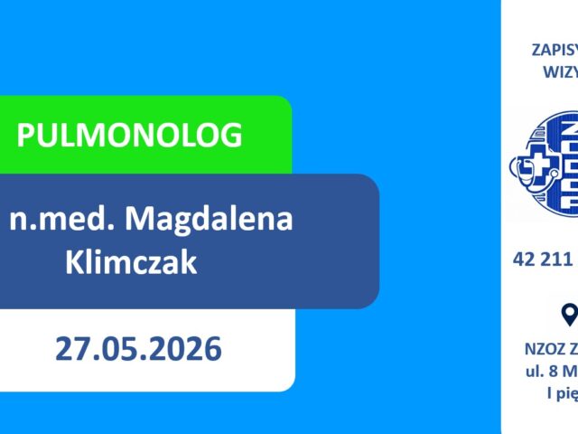Zapraszamy na poradę specjalistyczną u lekarza pulmonologa dr n.med. Magdaleny Klimczak. Najbliższy dostępny termin wizyty prywatnej to 27 maja 2026 roku. Zapisy przyjmujemy w rejestracji przychodni (osobiście lub telefonicznie). ZAPRASZAMY