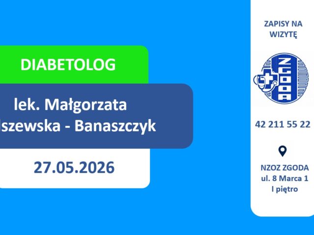 Najbliższy dostępny termin wizyty prywatnej w poradni diabetologicznej u lekarza diabetologa Małgorzaty Olszewskiej-Banaszczyk to 27 maj 2026 roku. Zapisy przyjmujemy w rejestracji przychodni (osobiście lub telefonicznie) – tel. 42 211 55 22 ZAPRASZAMY